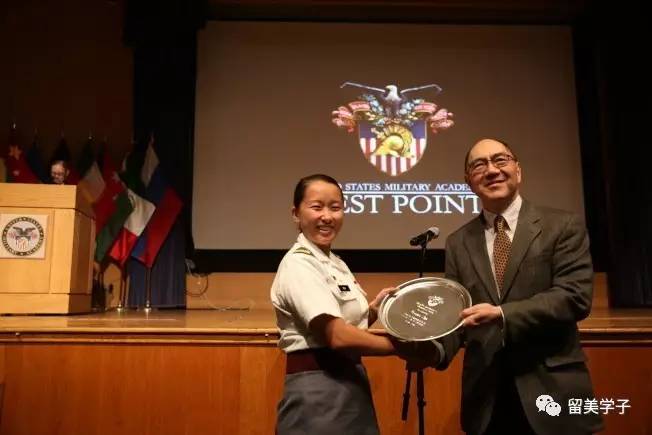温子仪(右)向在中文学习和亚裔研究上成绩杰出的西点毕业生颁发“温应星中将纪念奖学金”,2017年得主为华裔毕业生朱海舟(左)。(记者洪群超/摄影)