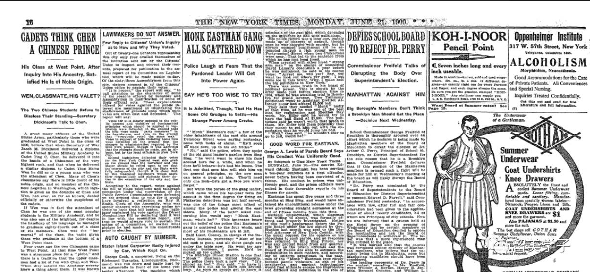美国国会刚于1904年通过将“排华法案”无限期延长的决定。参与修筑太平洋铁路的数万华工贡献被抹去,“唐人街”被骚扰、打砸,“黄祸”之说泛滥各地。华人移民在美国几乎人人自危,从事苦力劳作、经营小本生意乃至正常生活都饱受歧视,遑论进入美国高校学习。大学里,凤毛麟角的华人面孔基本全为清廷公派留学生,而西点军校这一美国军事最高学府首次出现华人面孔,更引爆关注。