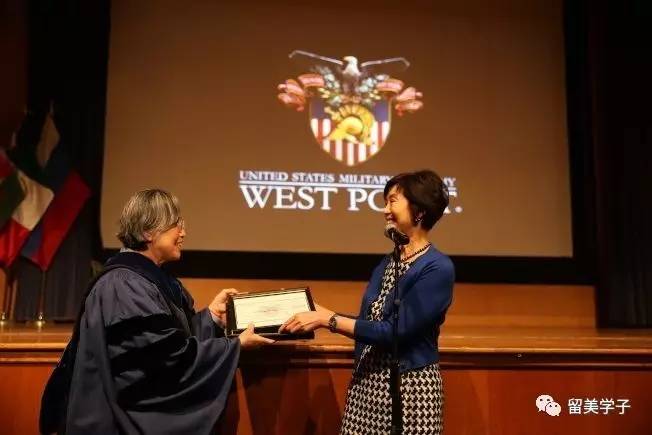 董温子华(右)颁发“温应星中将纪念奖学金旅行奖”,为两名优秀的西点学生提供前往中国大陆或台湾旅行的资金。西点军校中文系华裔教授王莅文(左)代表领受。(记者洪群超/摄影)